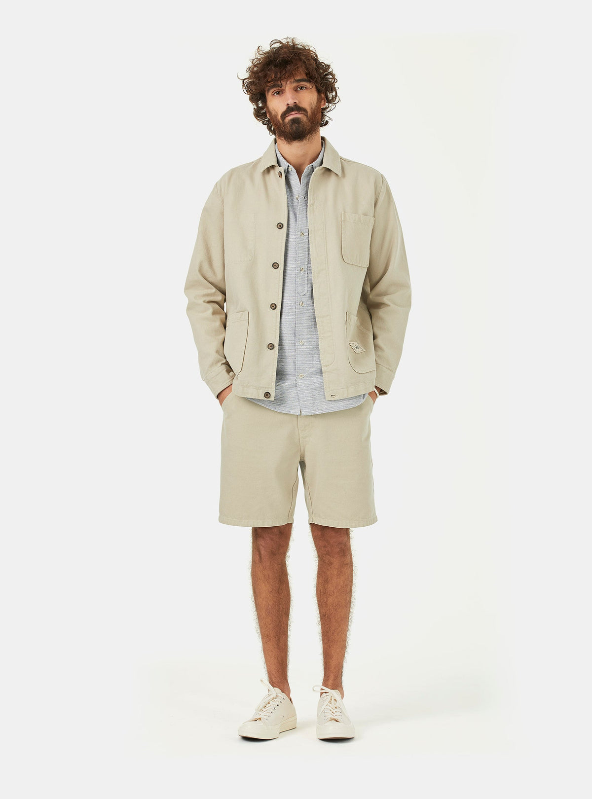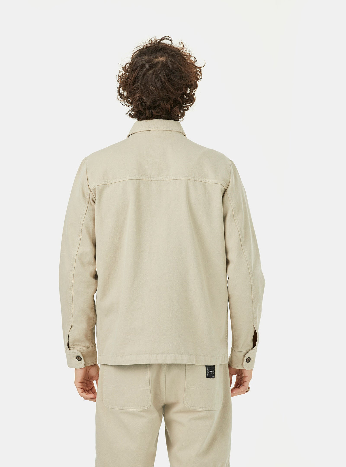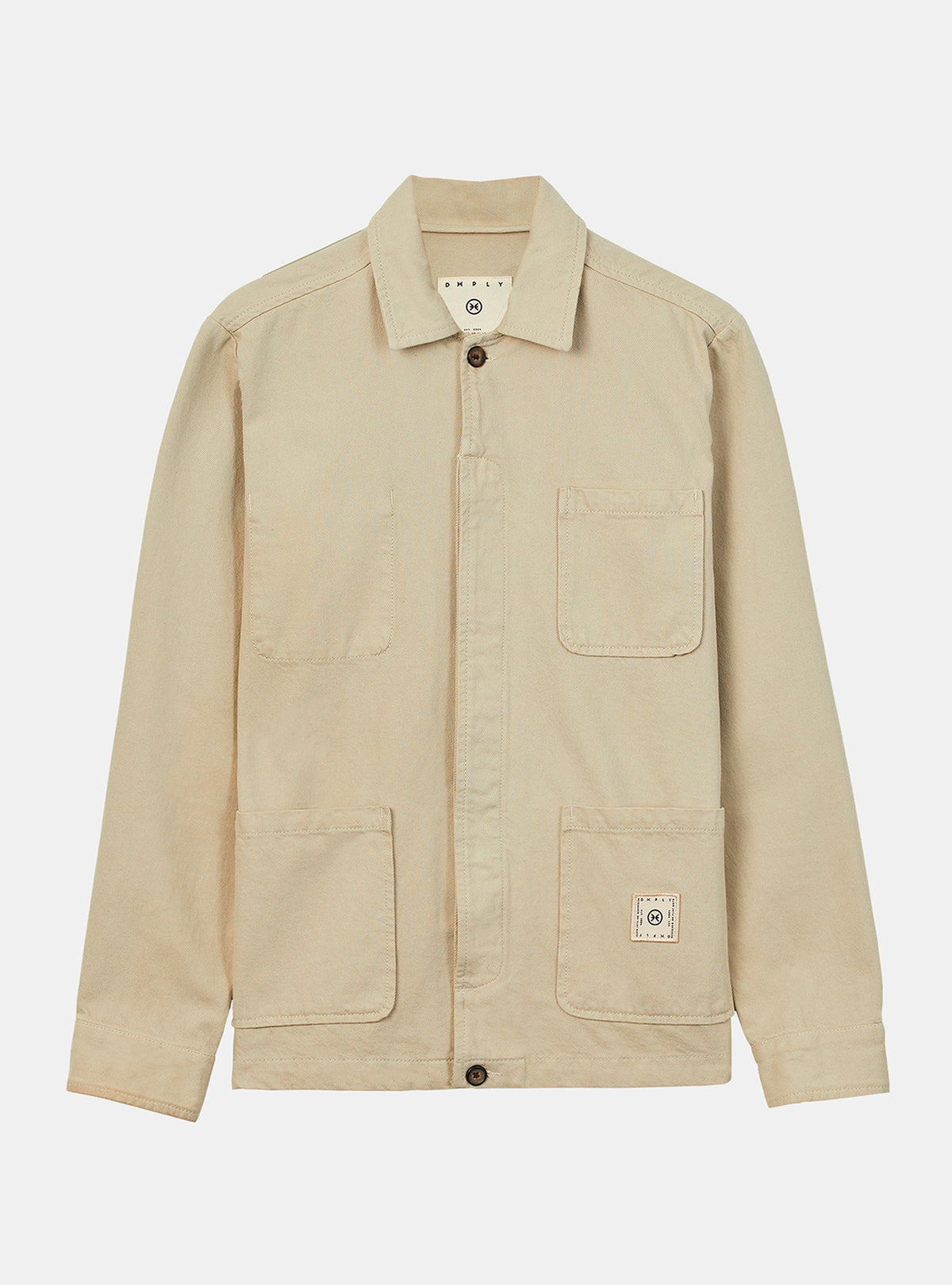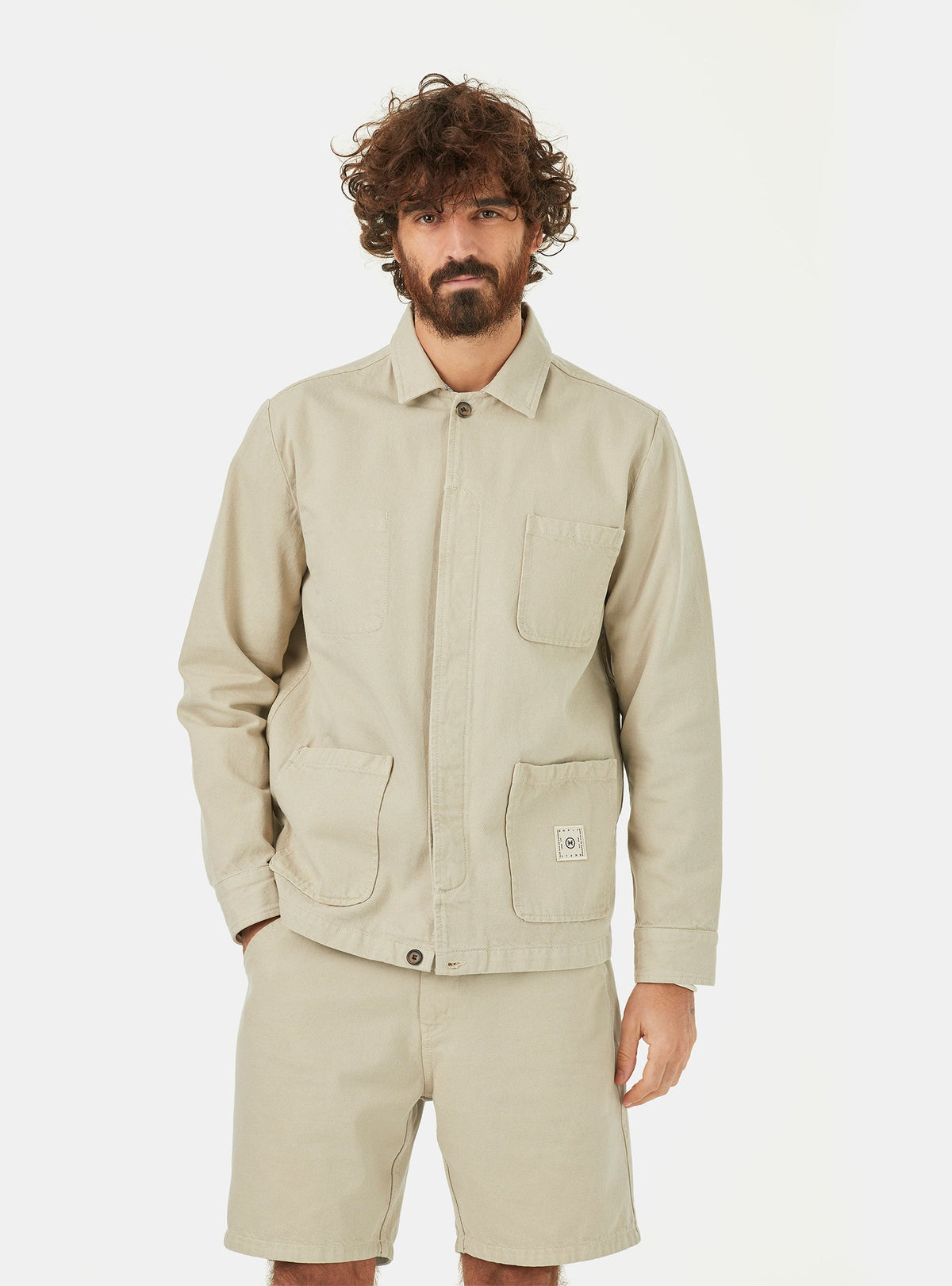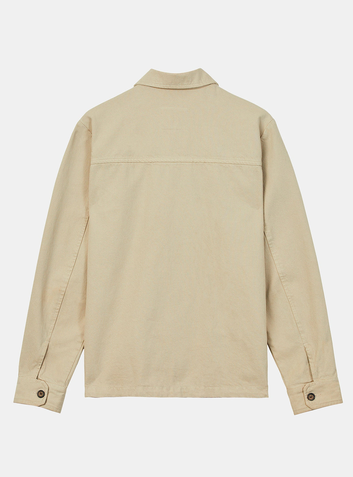 THE OUTLET 9/11 - Up to 70% Workwear inspired on twill jacket in sand colour. Made of a heavy mix of organic and recycled cotton canvas with soft touch hand feel. Vintage collar shape, 4 patch pockets on the outside and another secret one on the inside with conscience message artwork print. Invisible placket on the front with new life buttons made of left-overs. Brand patch placed the bottom left pocket. Clean premium finishing. Regular back yoke on the back. Adjustable buttons system on the cuffs for extra comfort and functionality.