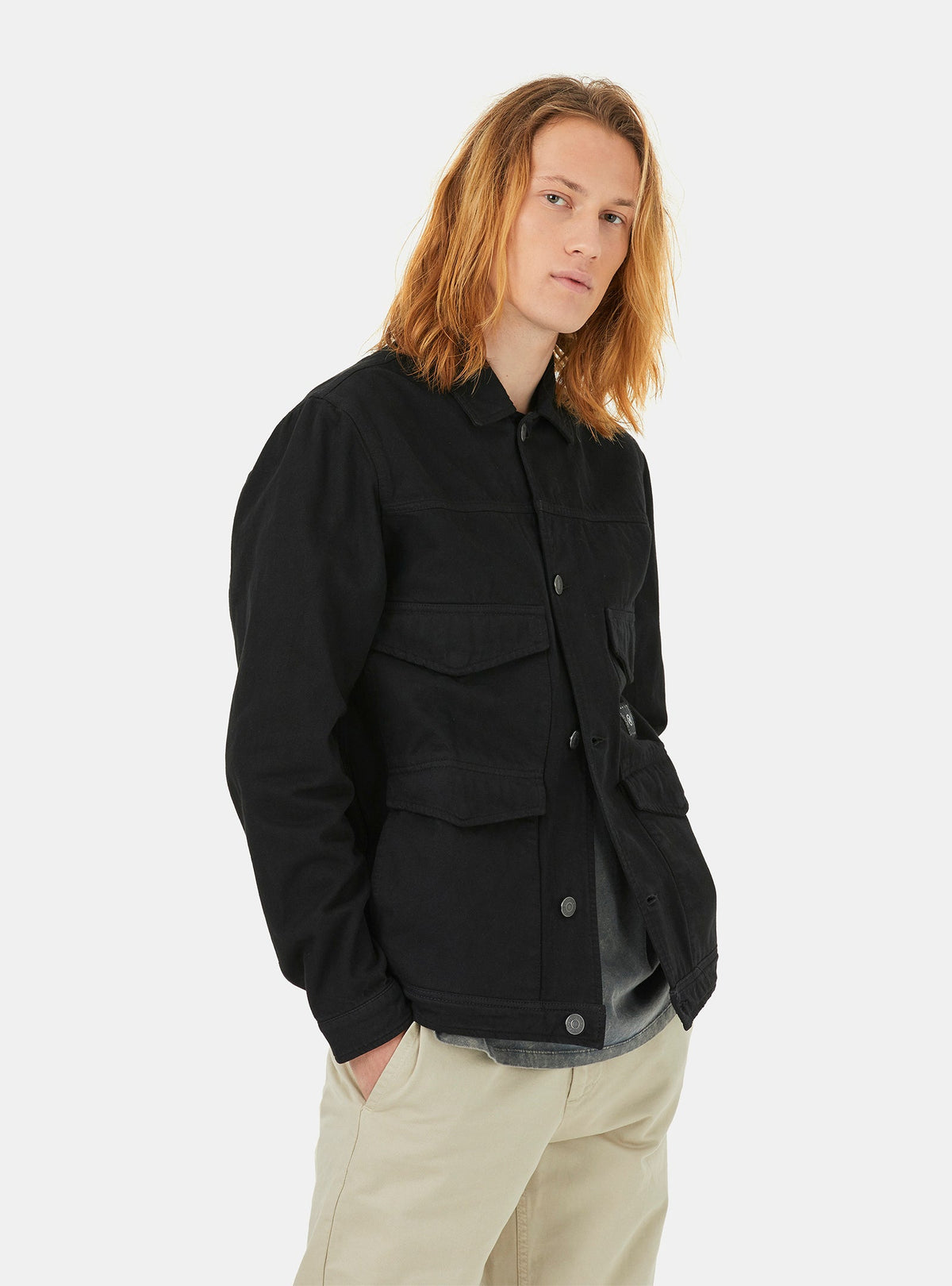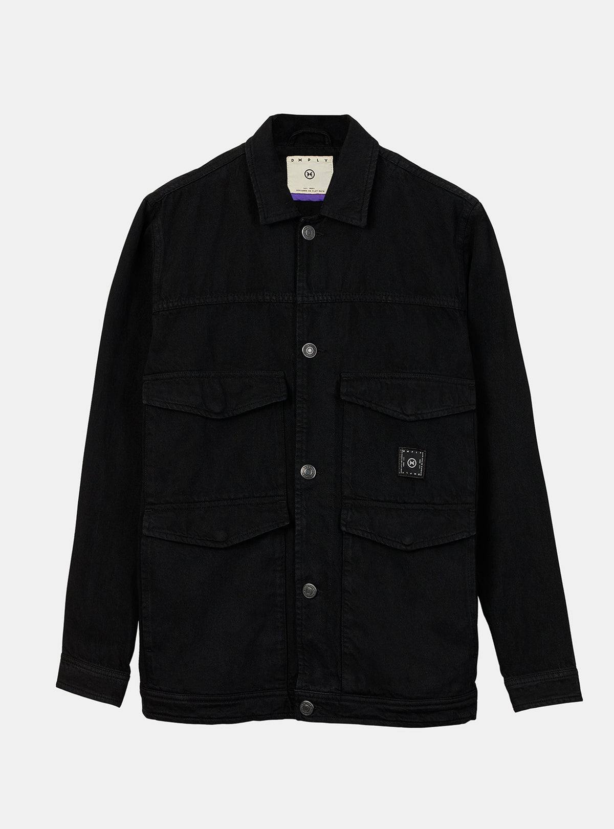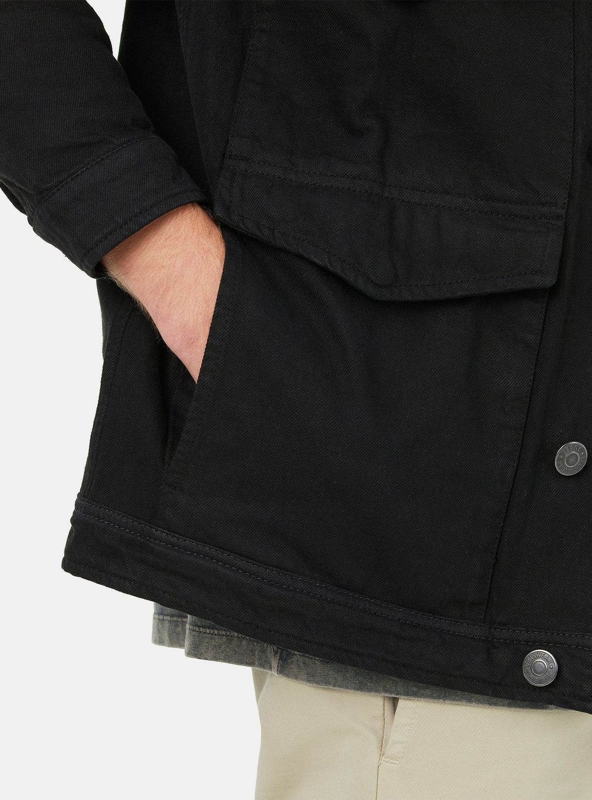 THE OUTLET 9/11 - Up to 70% Workwear inspired long trucker jacket in dark caviar colour. Made of a heavy mix of organic and recycled cotton canvas with soft touch hand feel. Regular collar shape, multi pockets on the outside with 2 secret ones on the inside with conscience message artwork print. Invisible snaps on the pocket flaps. New life buttons made of left overs. Brand patch placed in pocket. Clean premium finishing with contrast pop colour binding inside. Regular back yoke on the back. Adjustable buttons system on the cuffs for extra comfort and functionality.