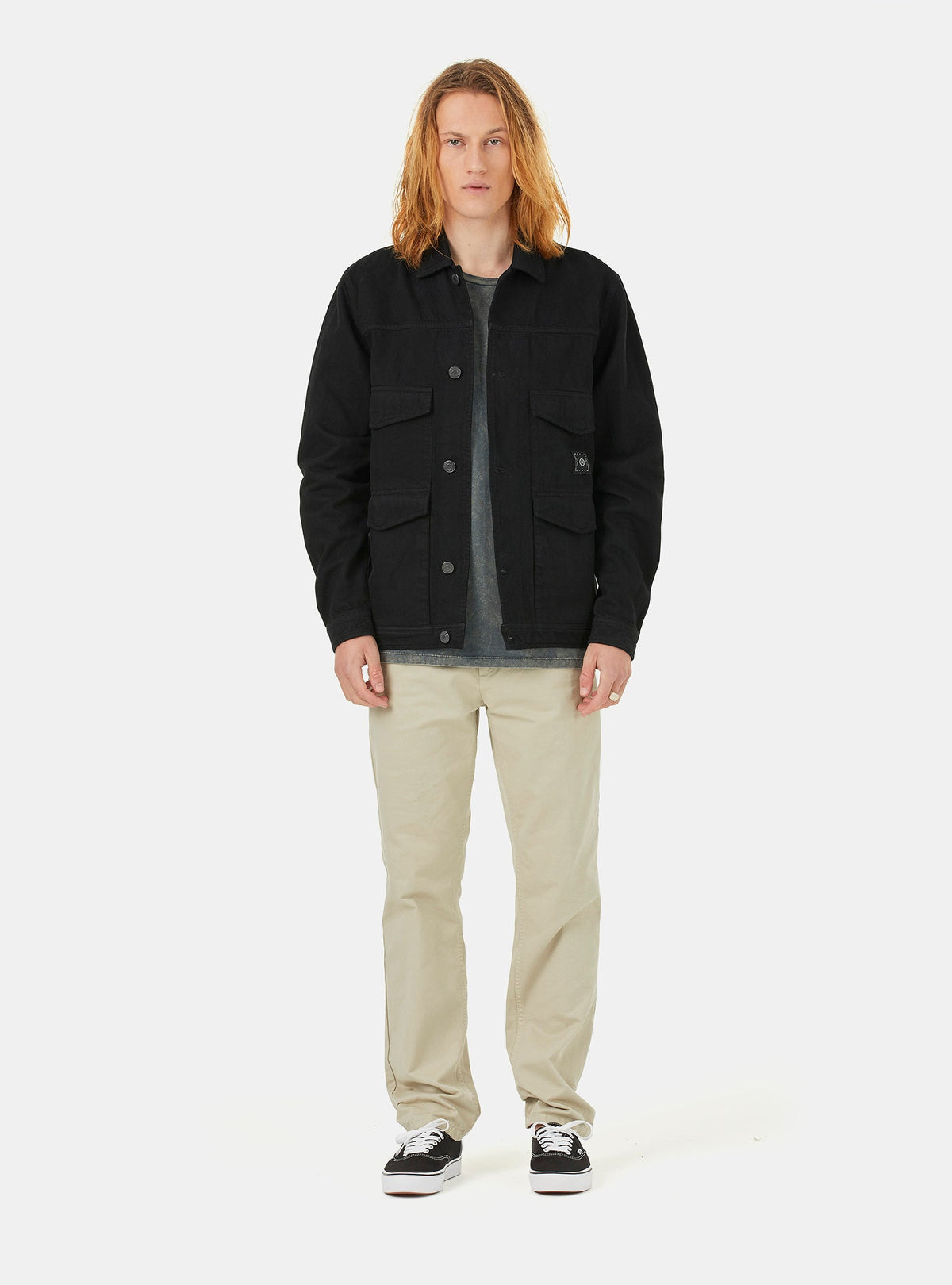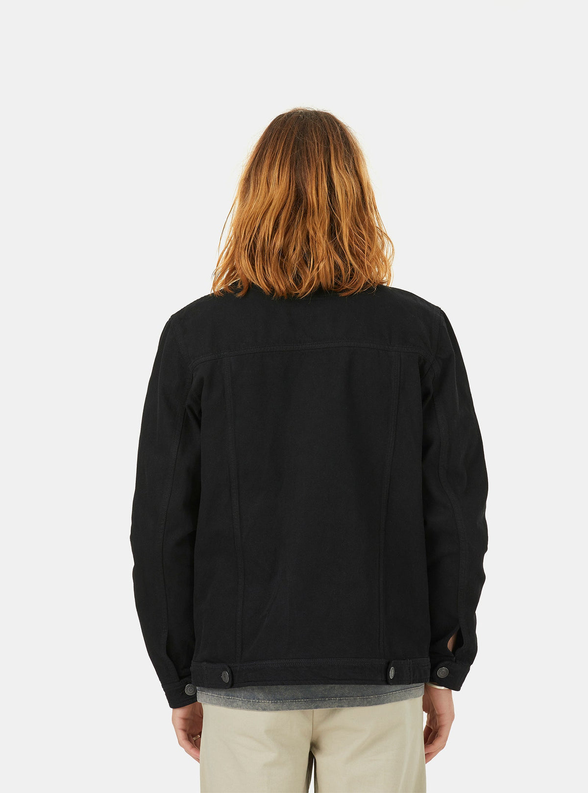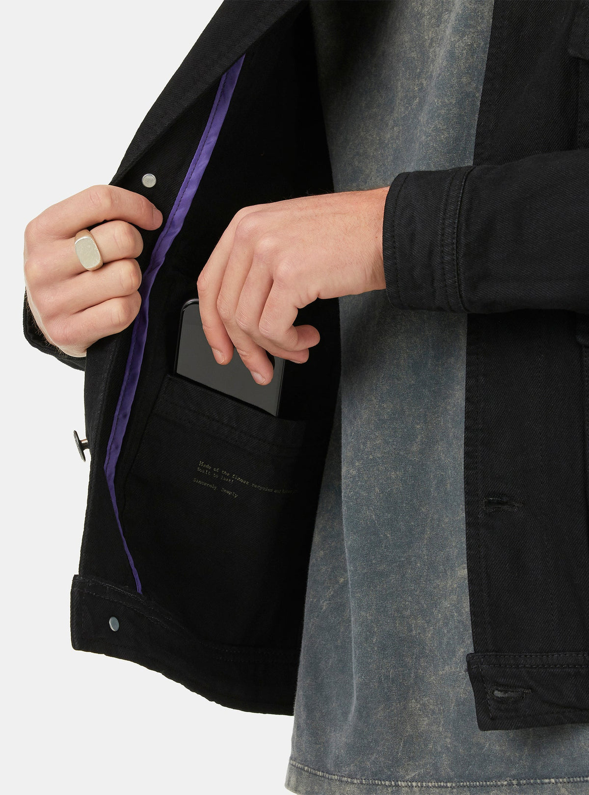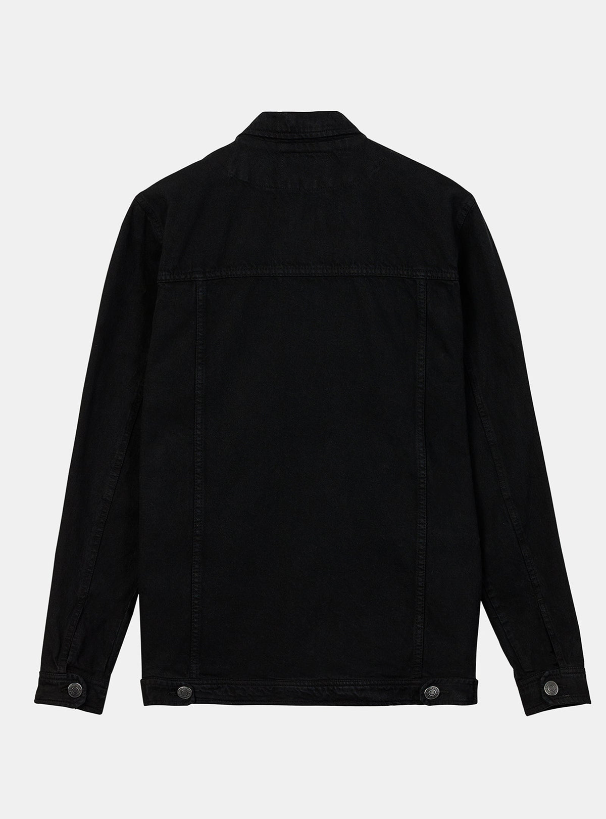 THE OUTLET 9/11 - Up to 70% Workwear inspired long trucker jacket in dark caviar colour. Made of a heavy mix of organic and recycled cotton canvas with soft touch hand feel. Regular collar shape, multi pockets on the outside with 2 secret ones on the inside with conscience message artwork print. Invisible snaps on the pocket flaps. New life buttons made of left overs. Brand patch placed in pocket. Clean premium finishing with contrast pop colour binding inside. Regular back yoke on the back. Adjustable buttons system on the cuffs for extra comfort and functionality.