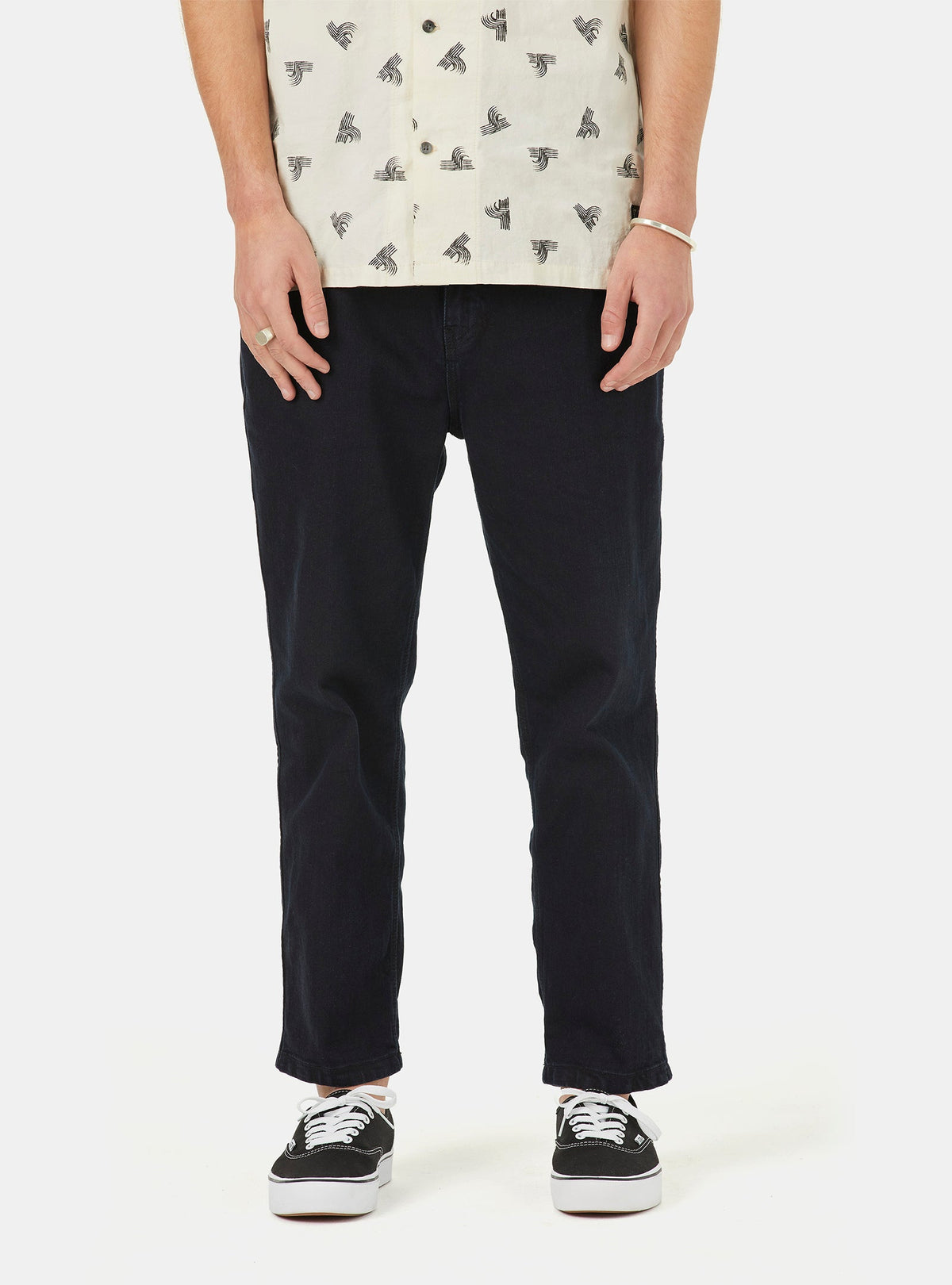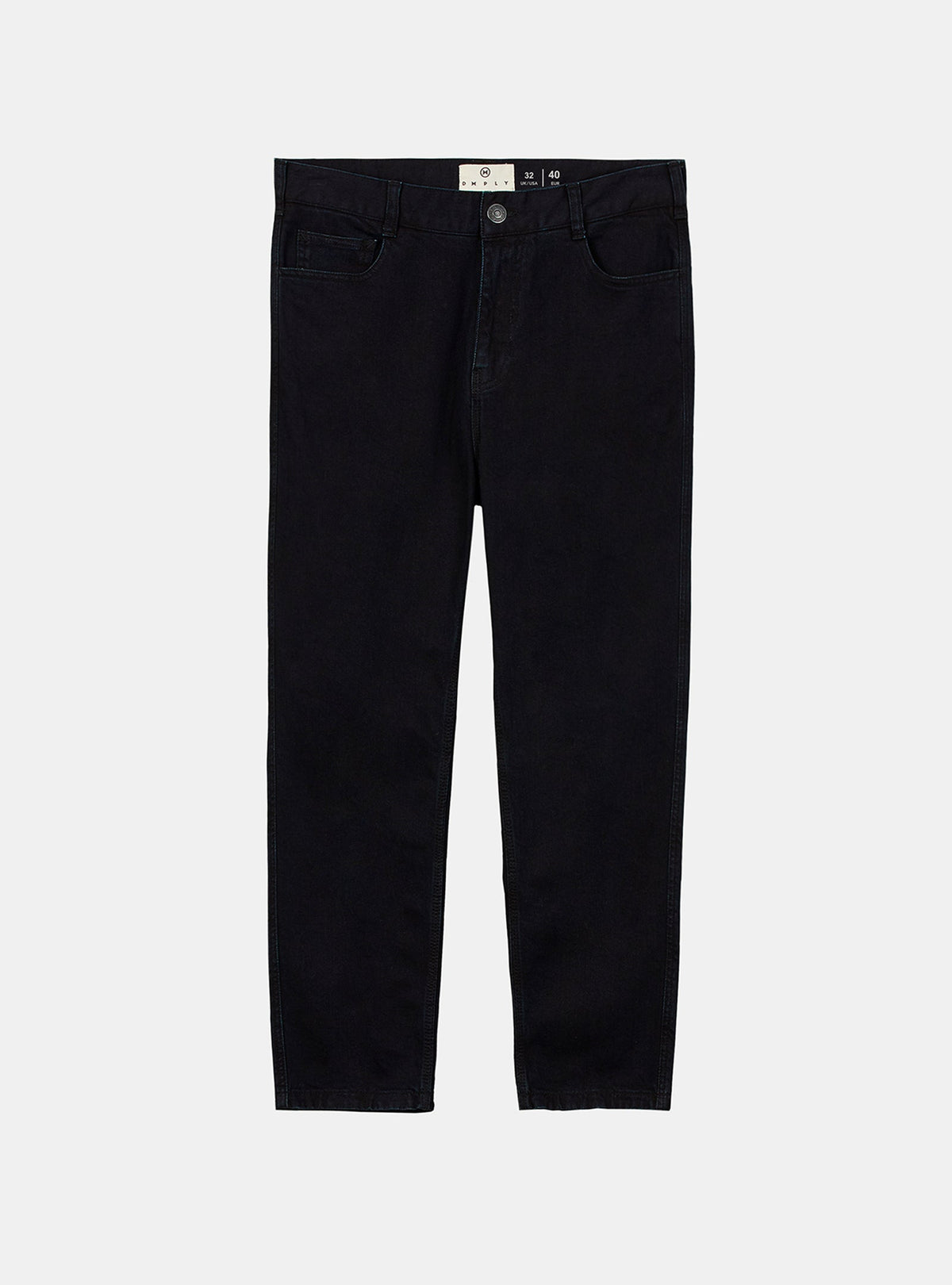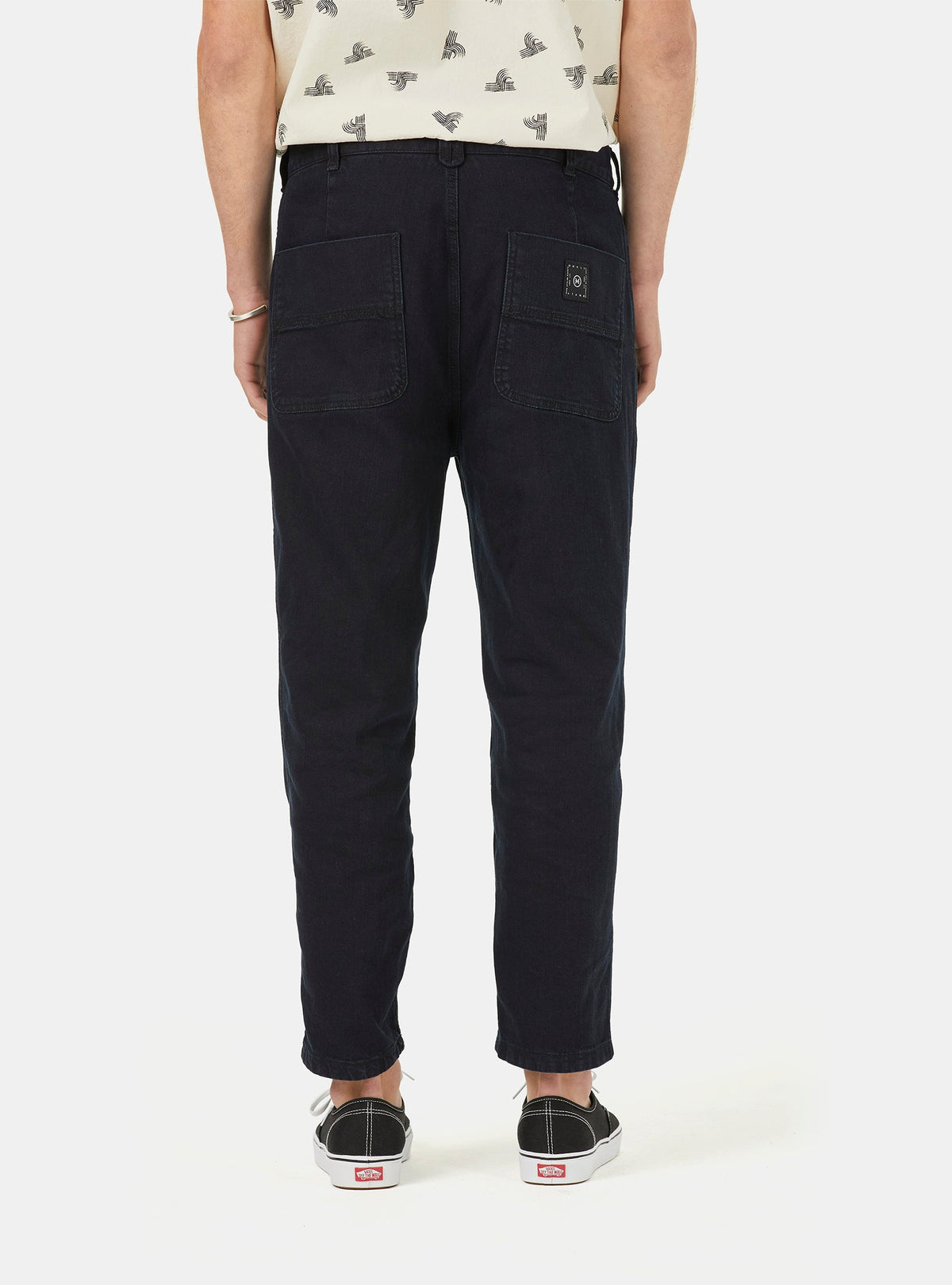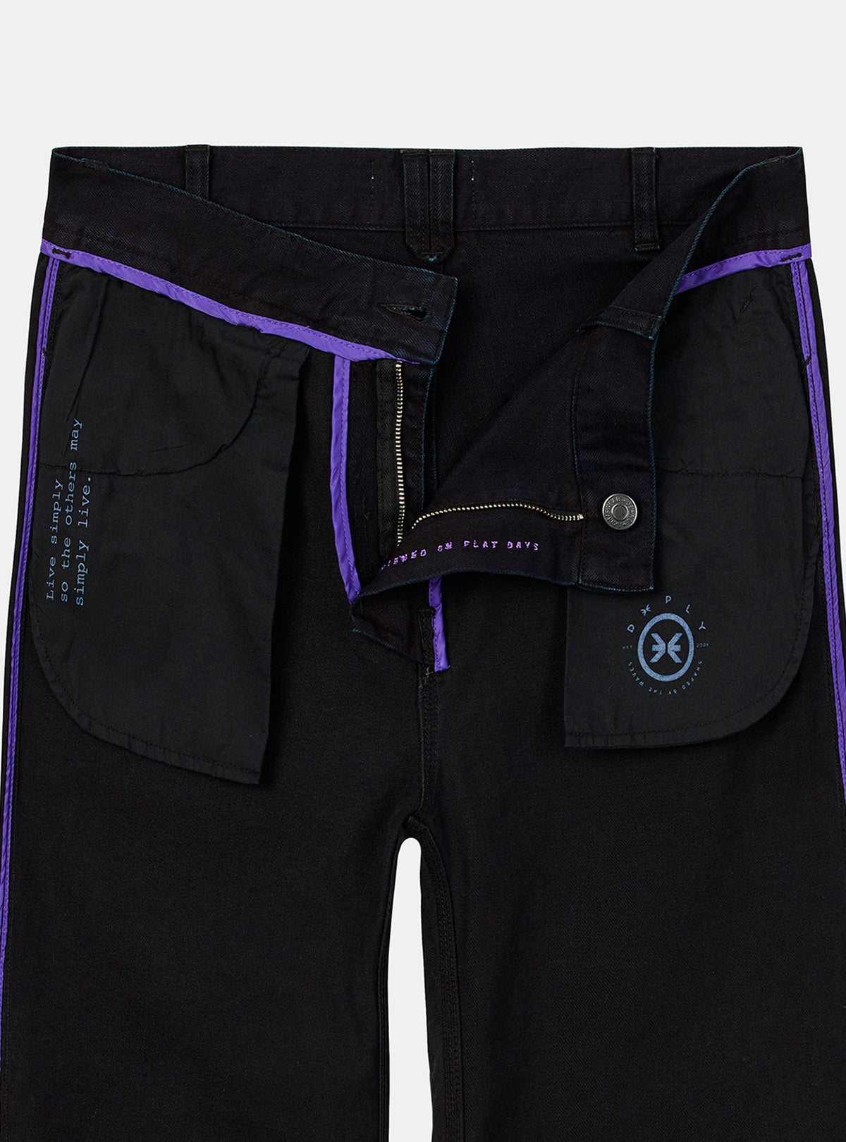 THE OUTLET 9/11 - Up to 70% Wide and loose cropped trousers made of blue/black denim twill with soft touch hand feel. Workwear inspired 5 pocket. Front placket with Designed on flat days embroidery inside. Conscience message artwork print on the pockets lining. 2 cowboy pockets on the front plus coin pocket, on the back 2 patch pockets one with brand patch. Clean premium finishes inside with contrast pop colour binding and spine grosgrain tape on the hem for extra durability.