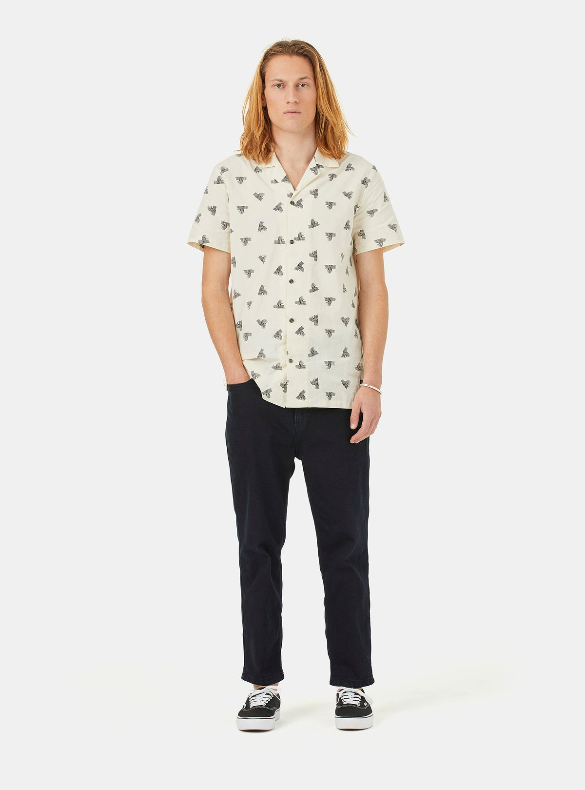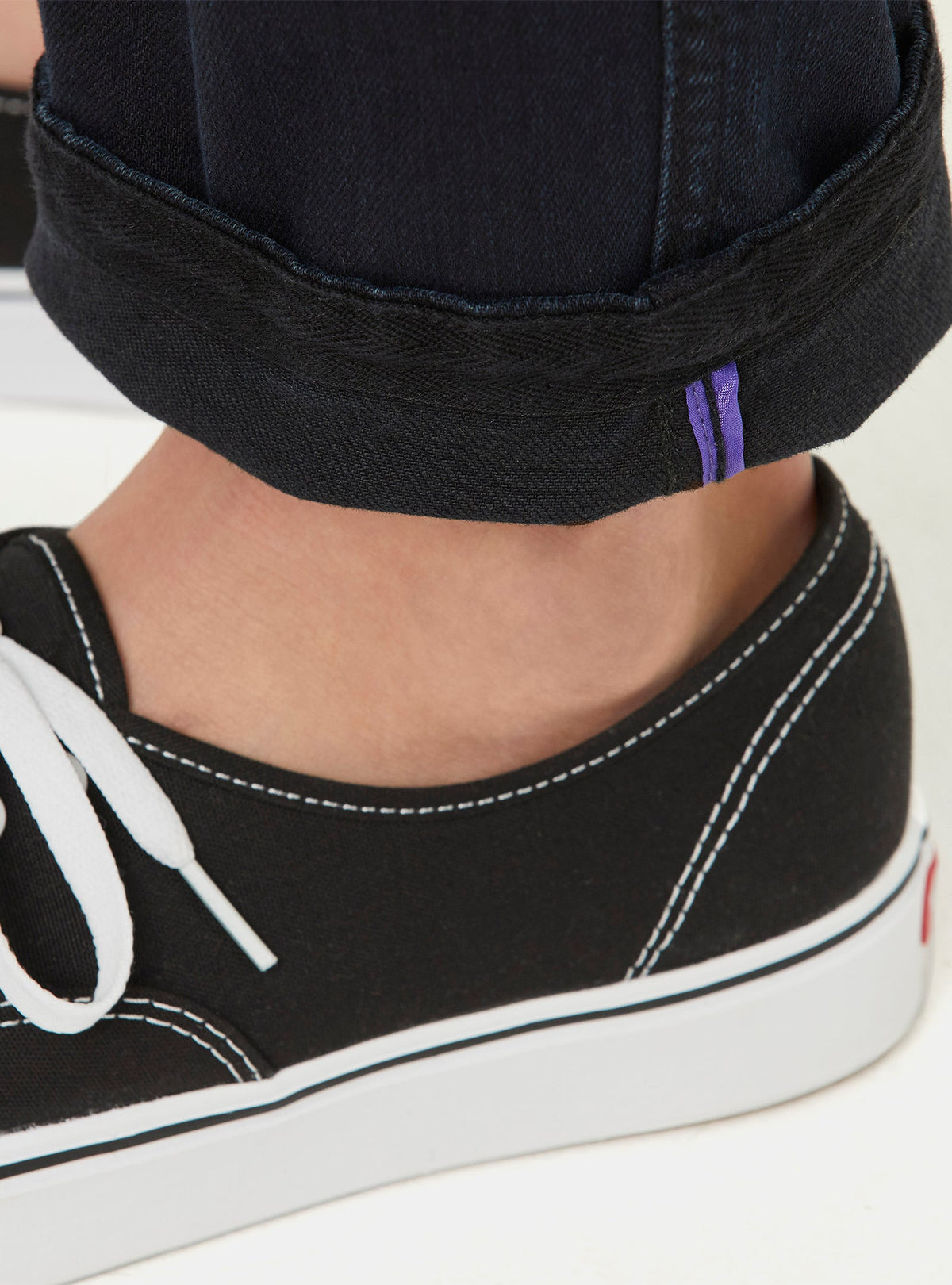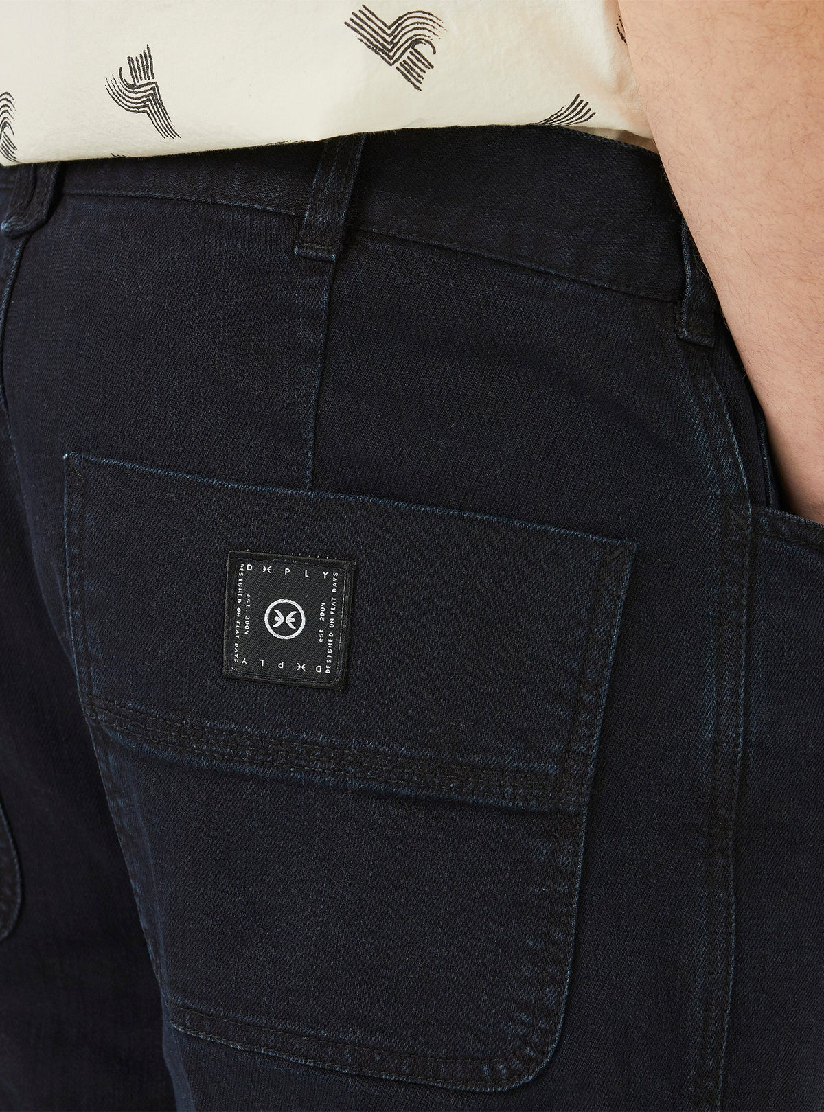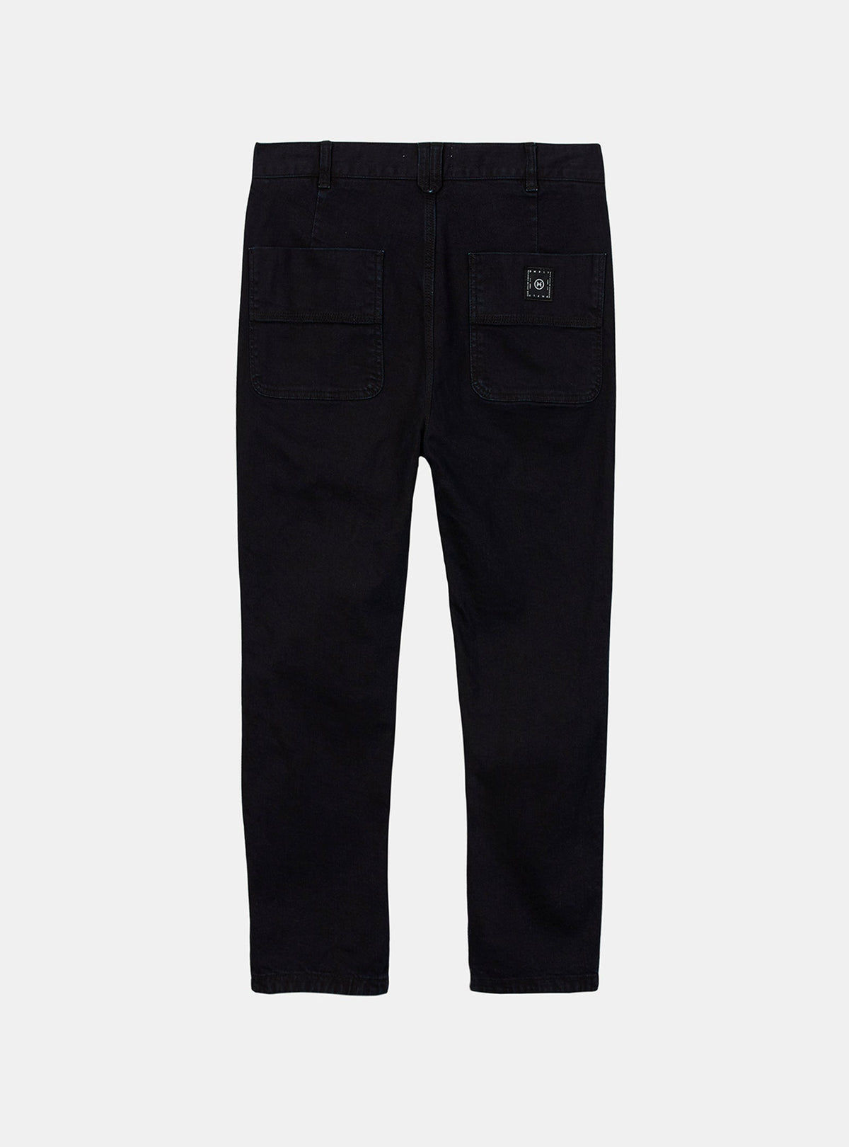 THE OUTLET 9/11 - Up to 70% Wide and loose cropped trousers made of blue/black denim twill with soft touch hand feel. Workwear inspired 5 pocket. Front placket with Designed on flat days embroidery inside. Conscience message artwork print on the pockets lining. 2 cowboy pockets on the front plus coin pocket, on the back 2 patch pockets one with brand patch. Clean premium finishes inside with contrast pop colour binding and spine grosgrain tape on the hem for extra durability.