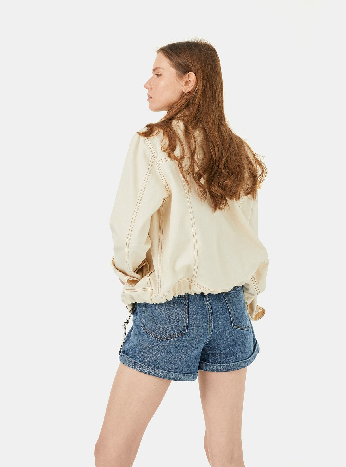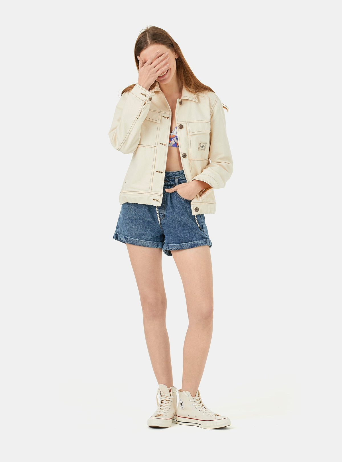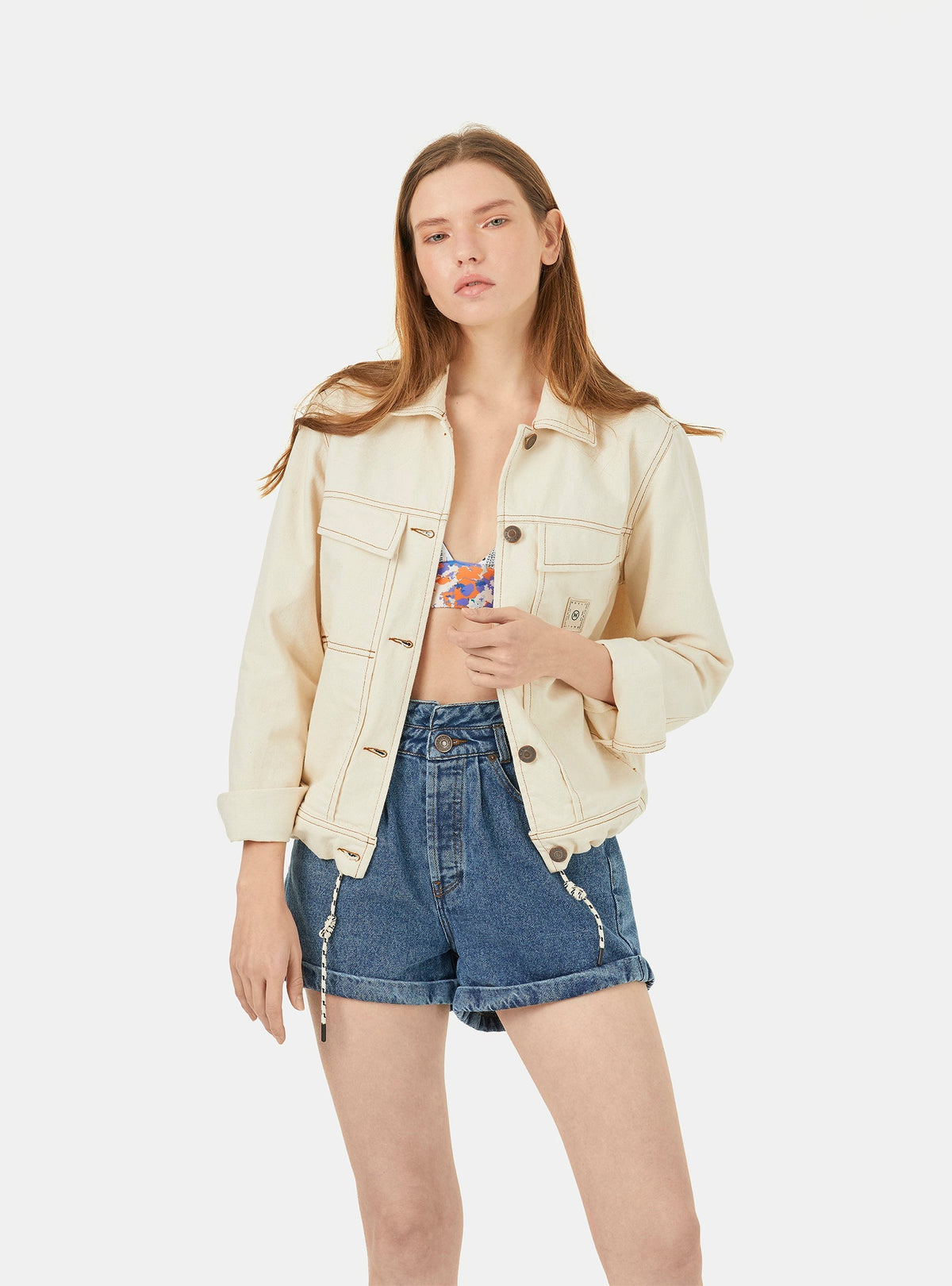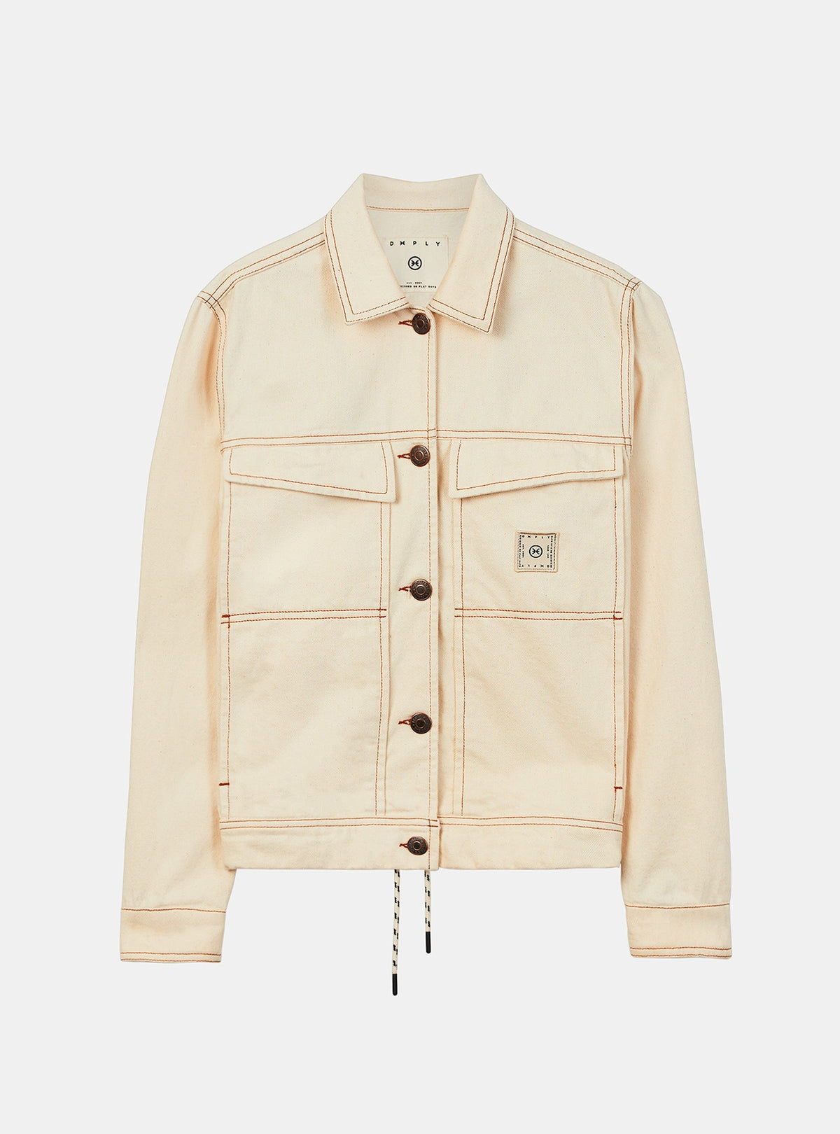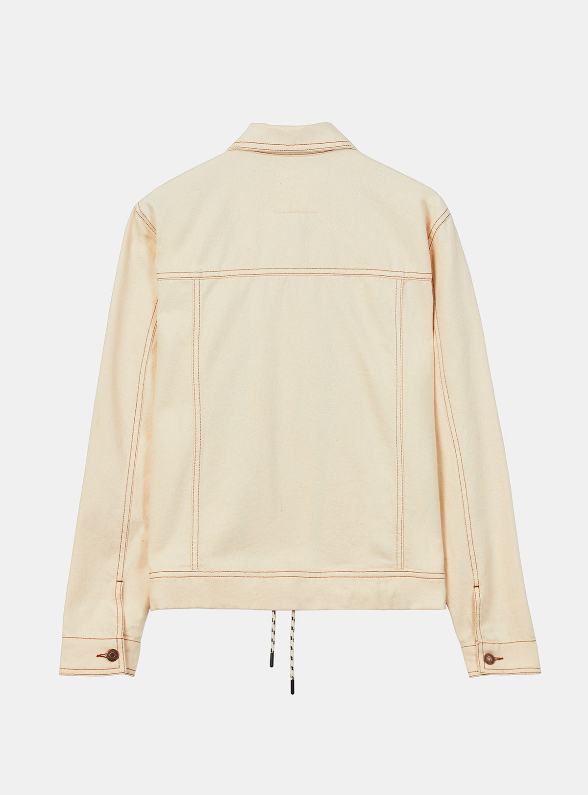 Workwear inspired long trucker jacket in off-white colour without bleach wash. Close up we can realise the small brown dots of the cotton shell. Made of a heavy mix of organic and recycled cotton canvas with soft touch hand feel. Regular collar shape, multi pockets on the outside 4 total plus 2 secret on the inside with conscience message artwork print. Brand patch placed on the pocket. Clean premium finishes with contrast pop colour binding inside. Regular back yoke on the back. Adjustable buttons system on the cuffs for extra comfort and functionality as well as the string system inside the waistband to change and style the silhouette according to your identity.