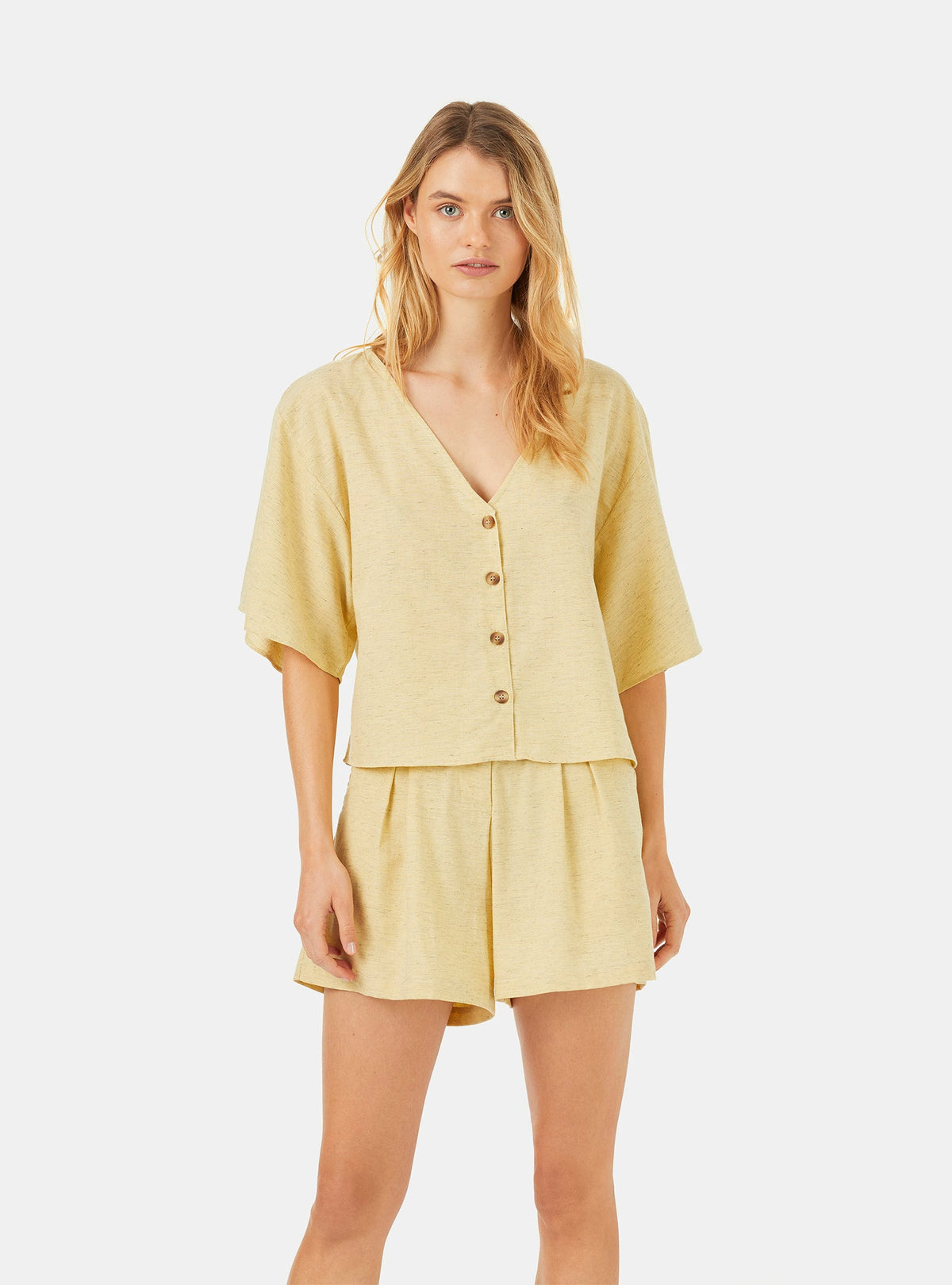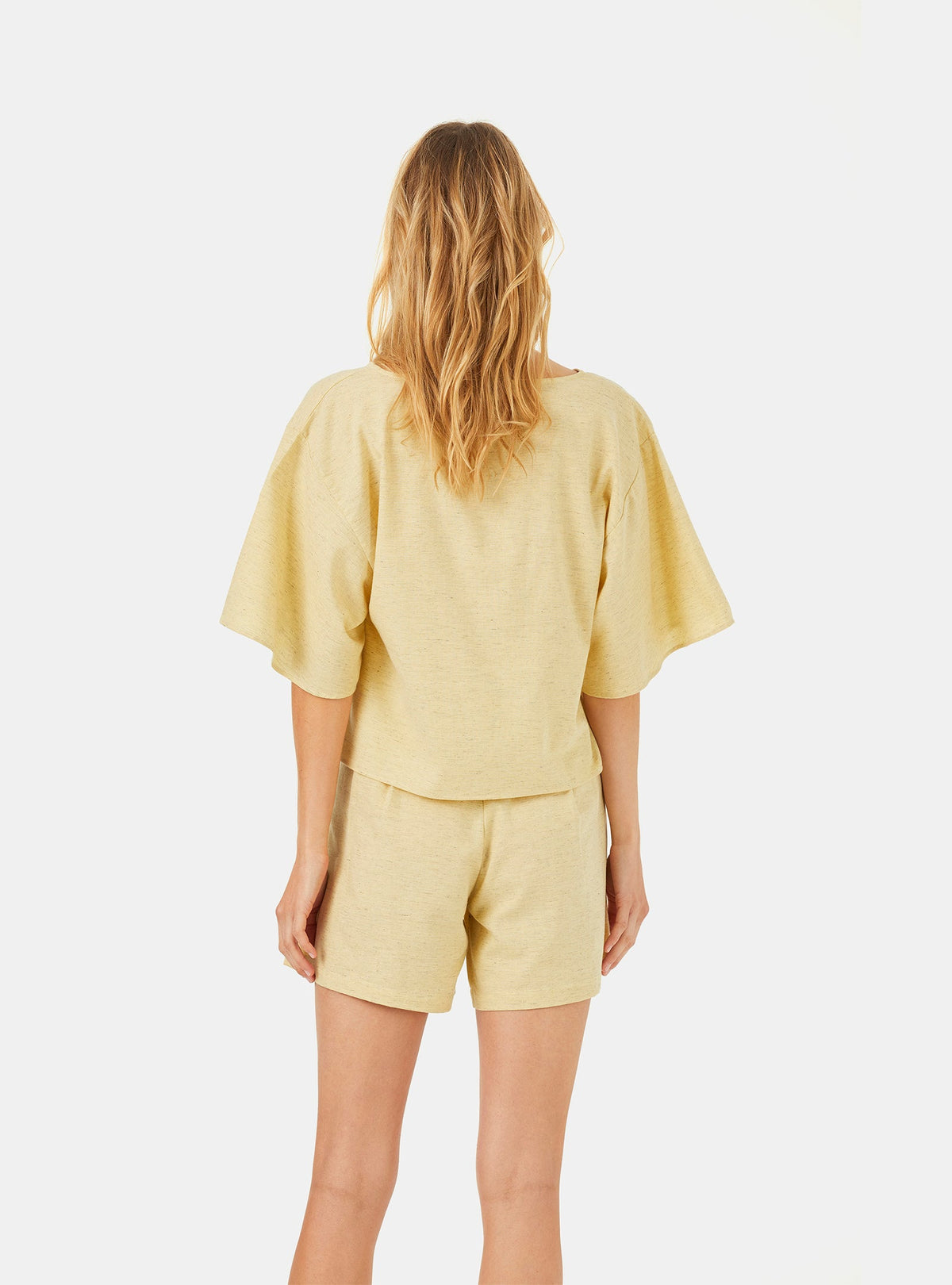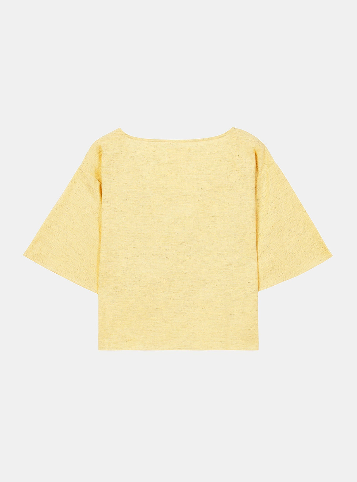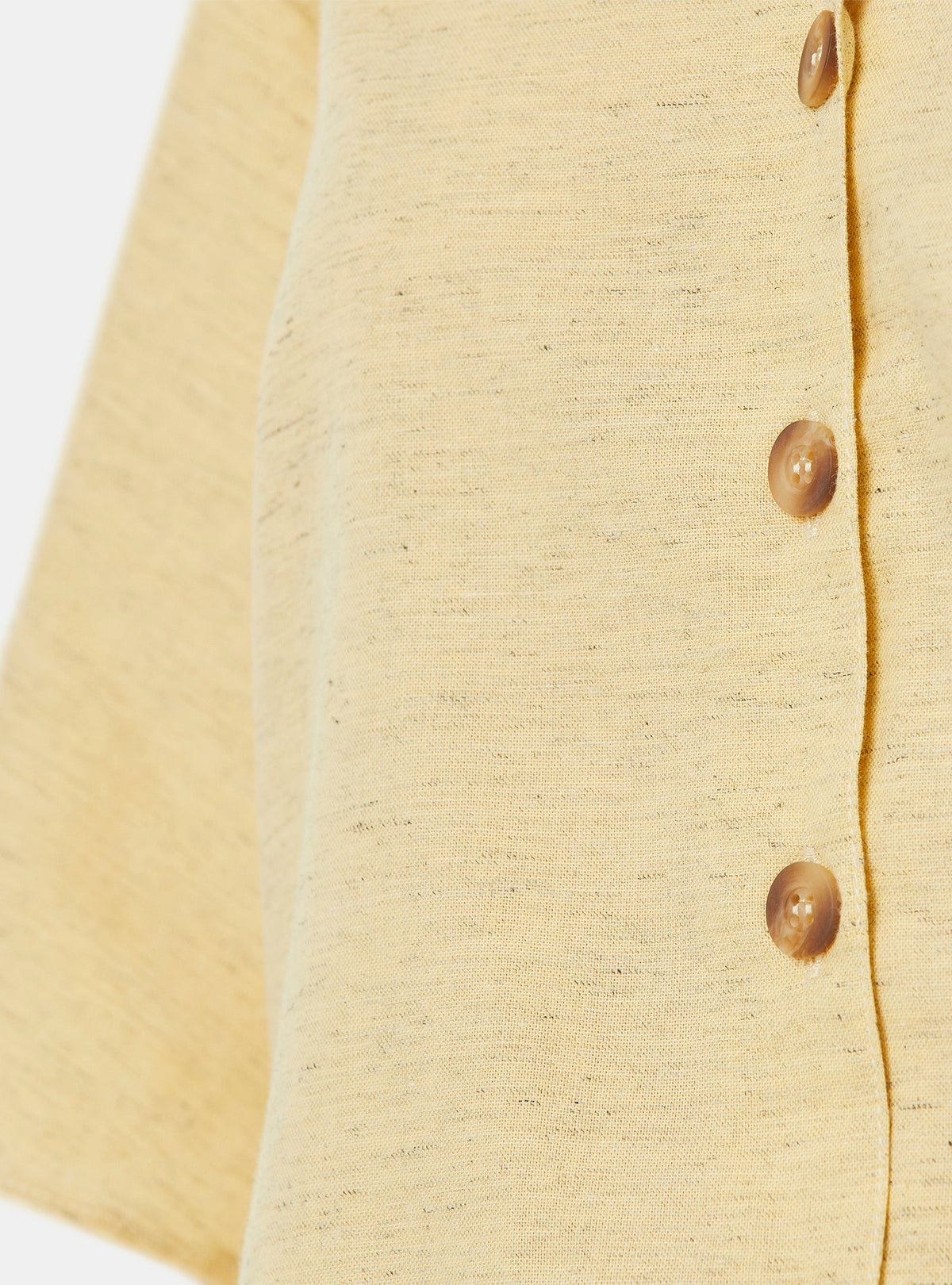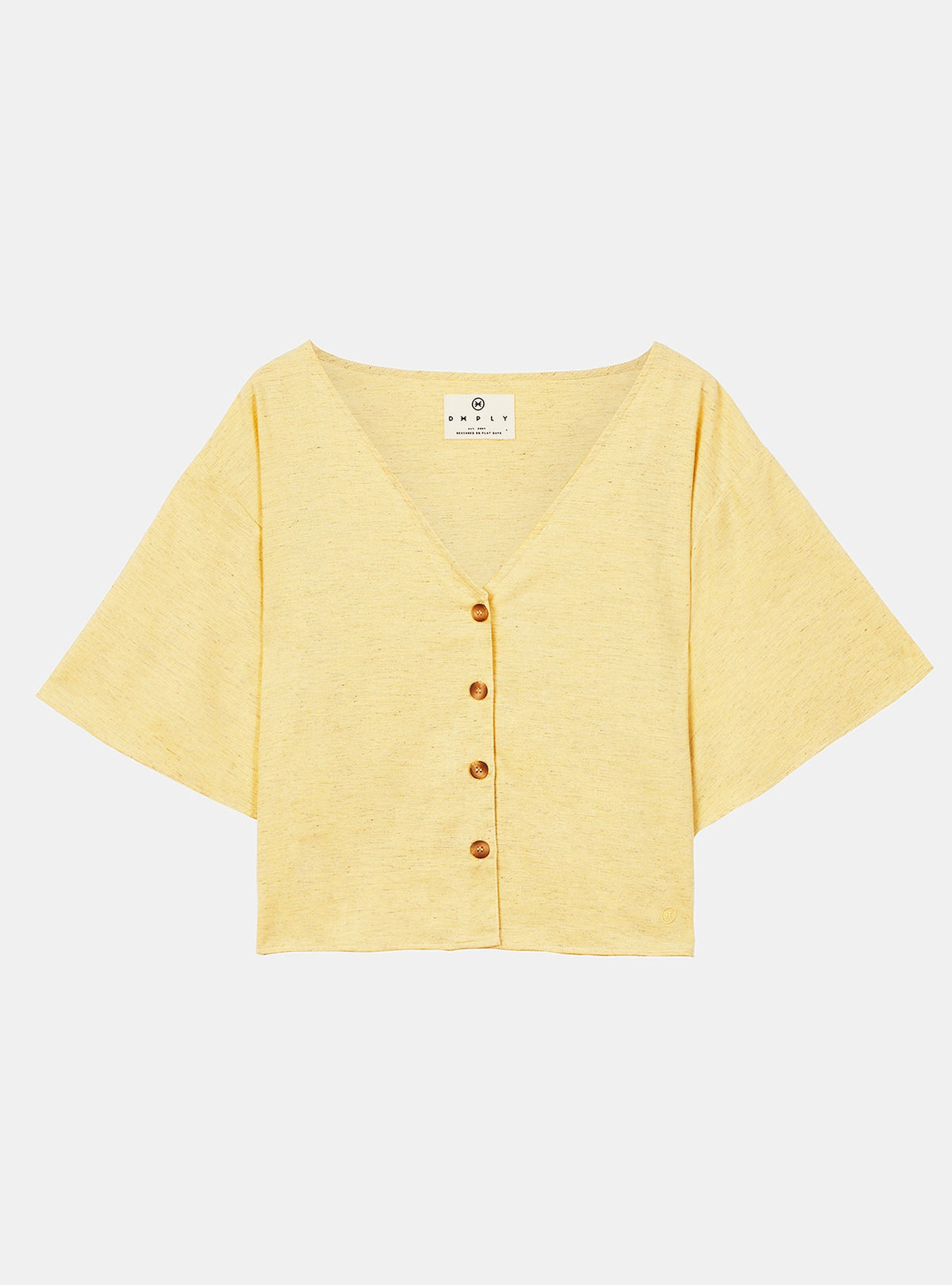 THE OUTLET 9/11 - Up to 70% V-neck cropped blouse with sophisticated woven fabric. Melange texture and light pastel yellow colour. Made of premium weave that mixes linen and cotton with soft touch hand feel. Breathable, fresh and light weight. New life buttons made of left-overs and Deeply small embroidery closer to the hem. Loose shoulders and wide sleeves reinforcing the feminine aesthetic with a lot of identity.