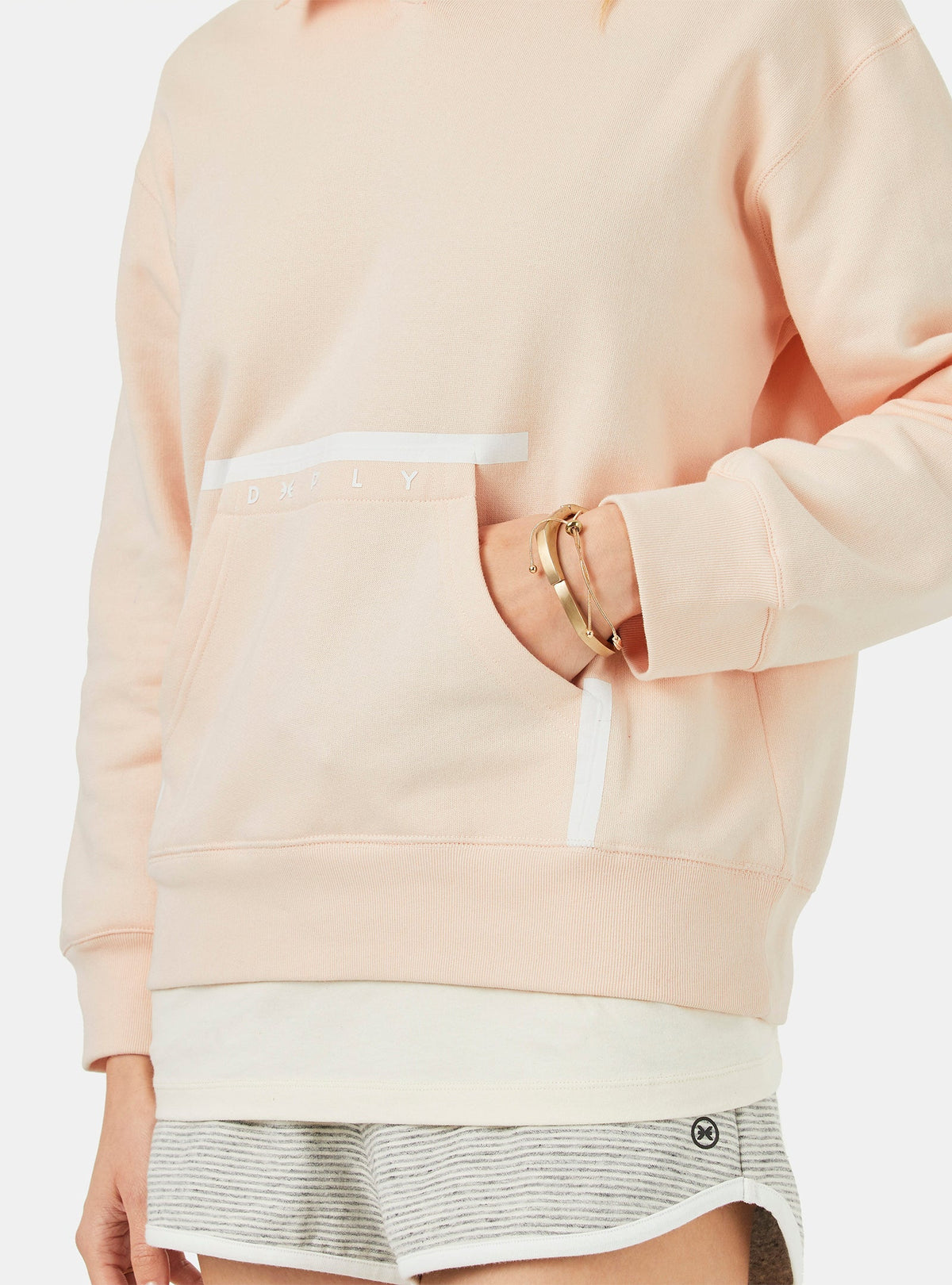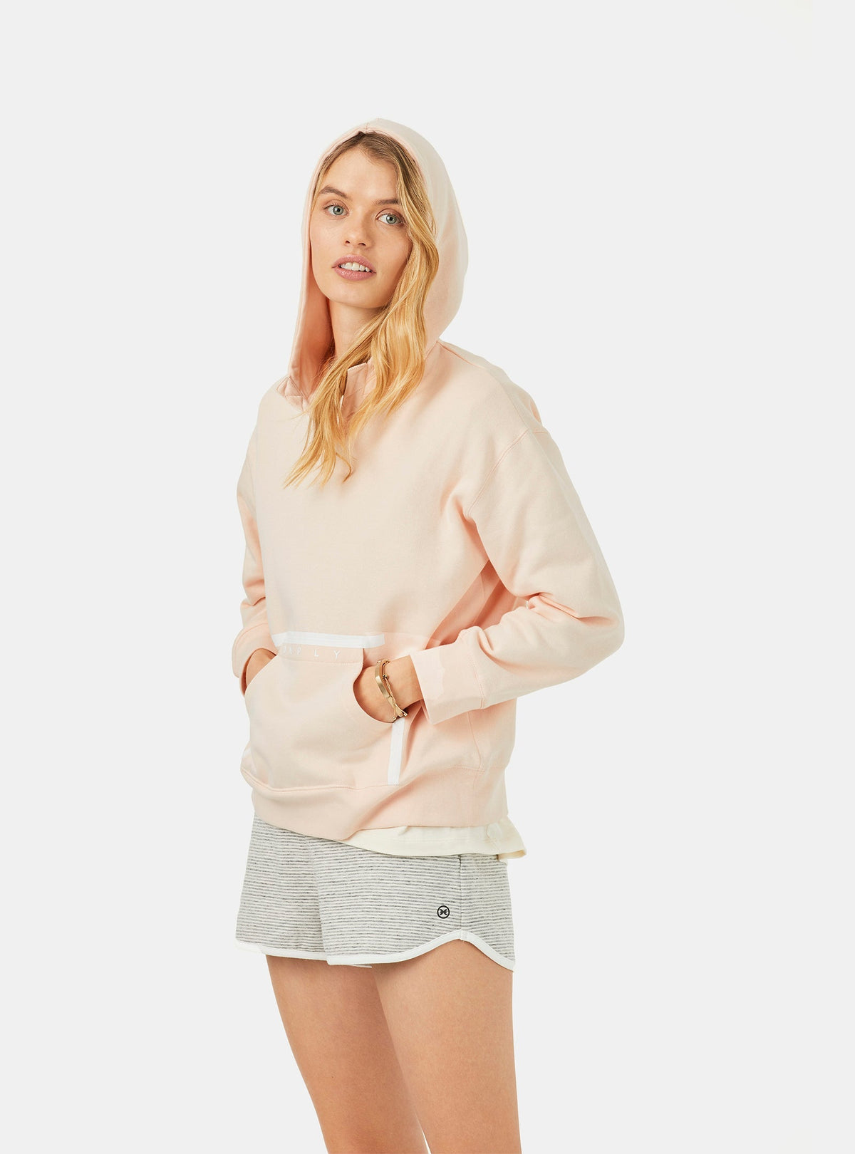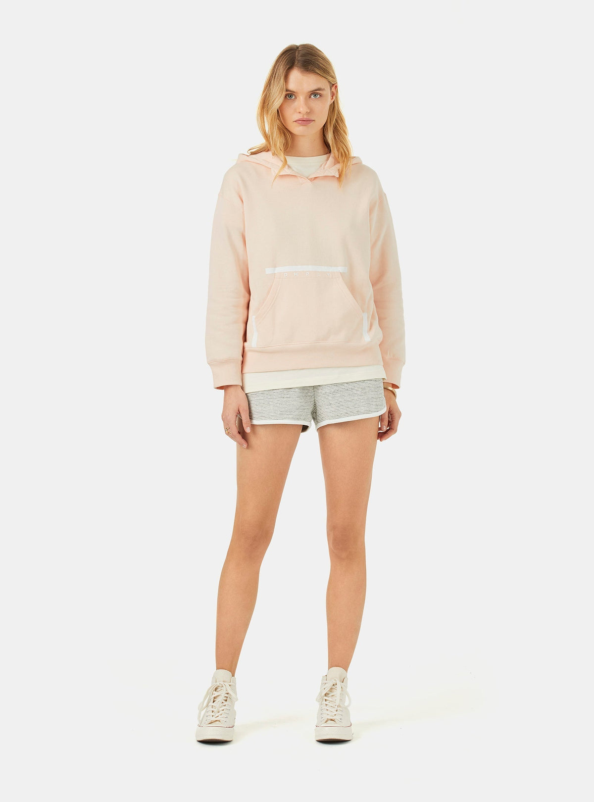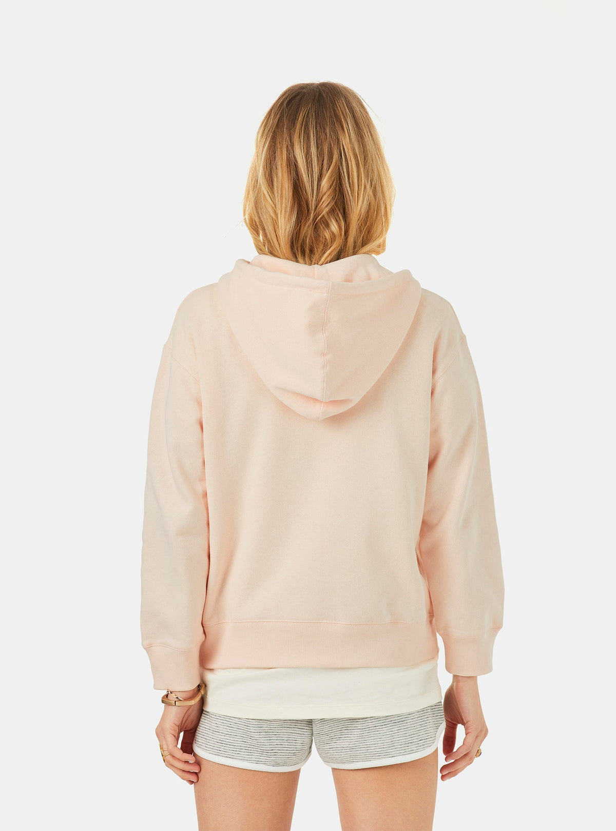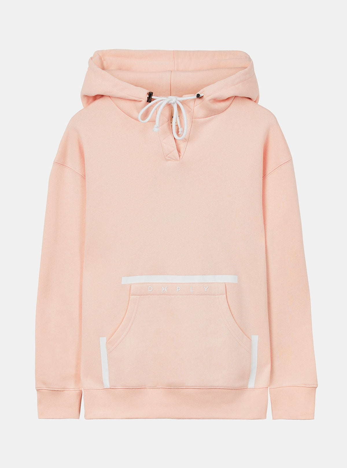 THE OUTLET 9/11 - Up to 70% Light pink Regular hoody made of 100% organic cotton with soft touch hand feel, 300gr and fluffy texture inside. Patch kangaroo pocket for extra comfort with sealed white print detail. Front placket with zigzag stitch detail, spaghetti white strings on the hood with metal stoppers adjustment. Clean premium finish with a neck seam cover tape matching background colour. Brand print on the front pocket. Cuffs and waistband in 1x1 rib improving the functionality and comfort. The clean perfect basic with renew aesthetic.