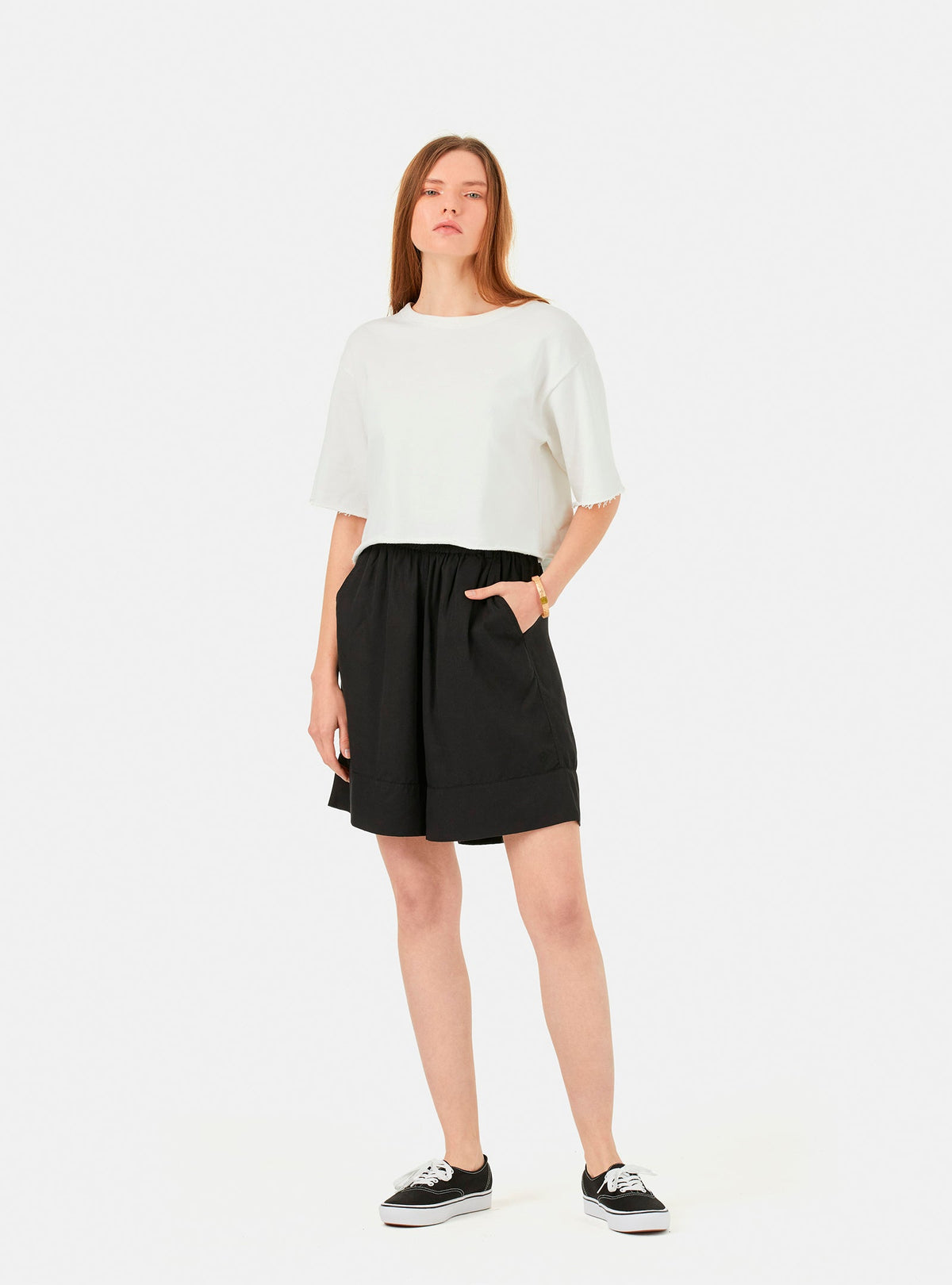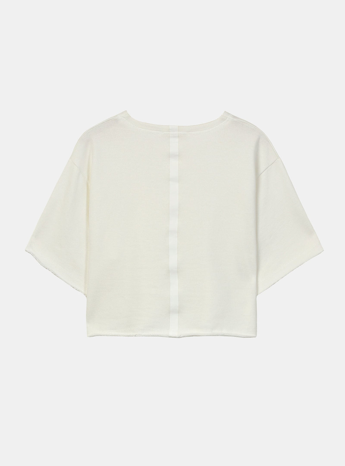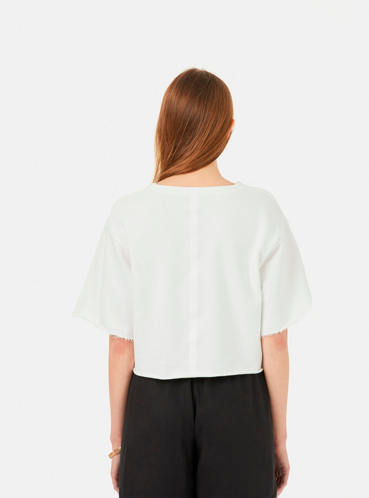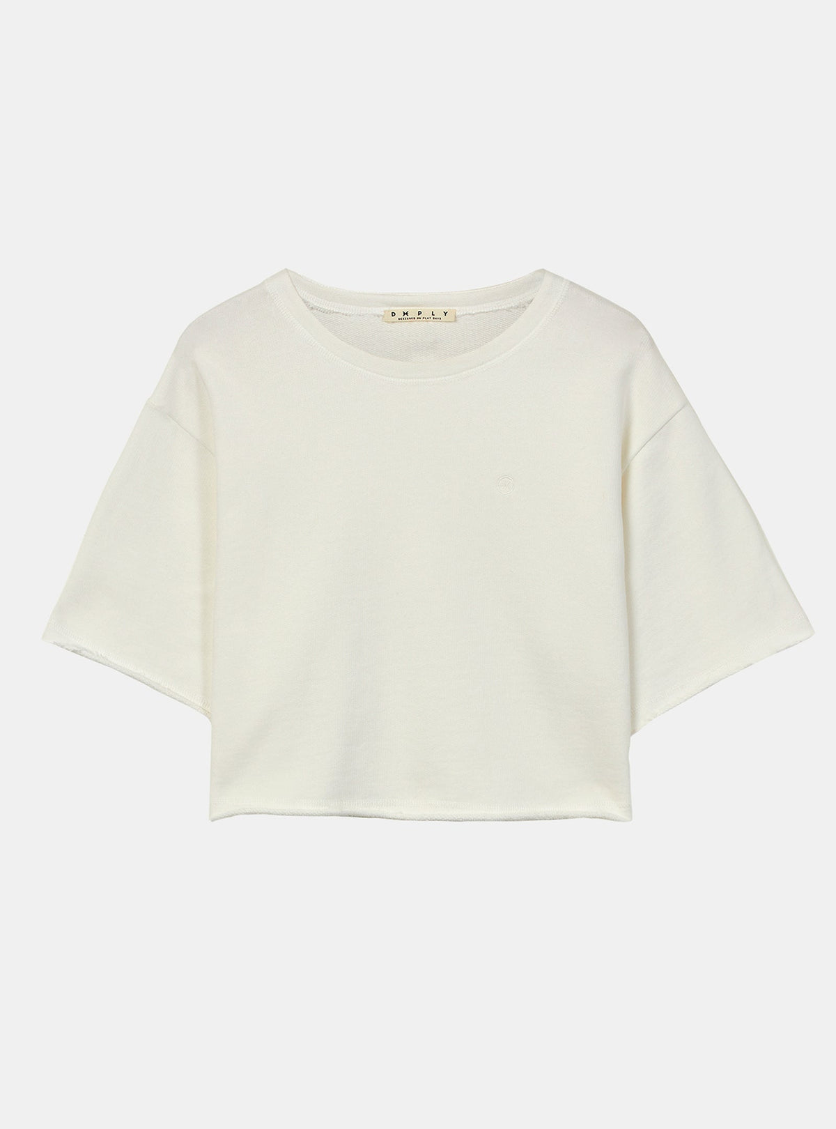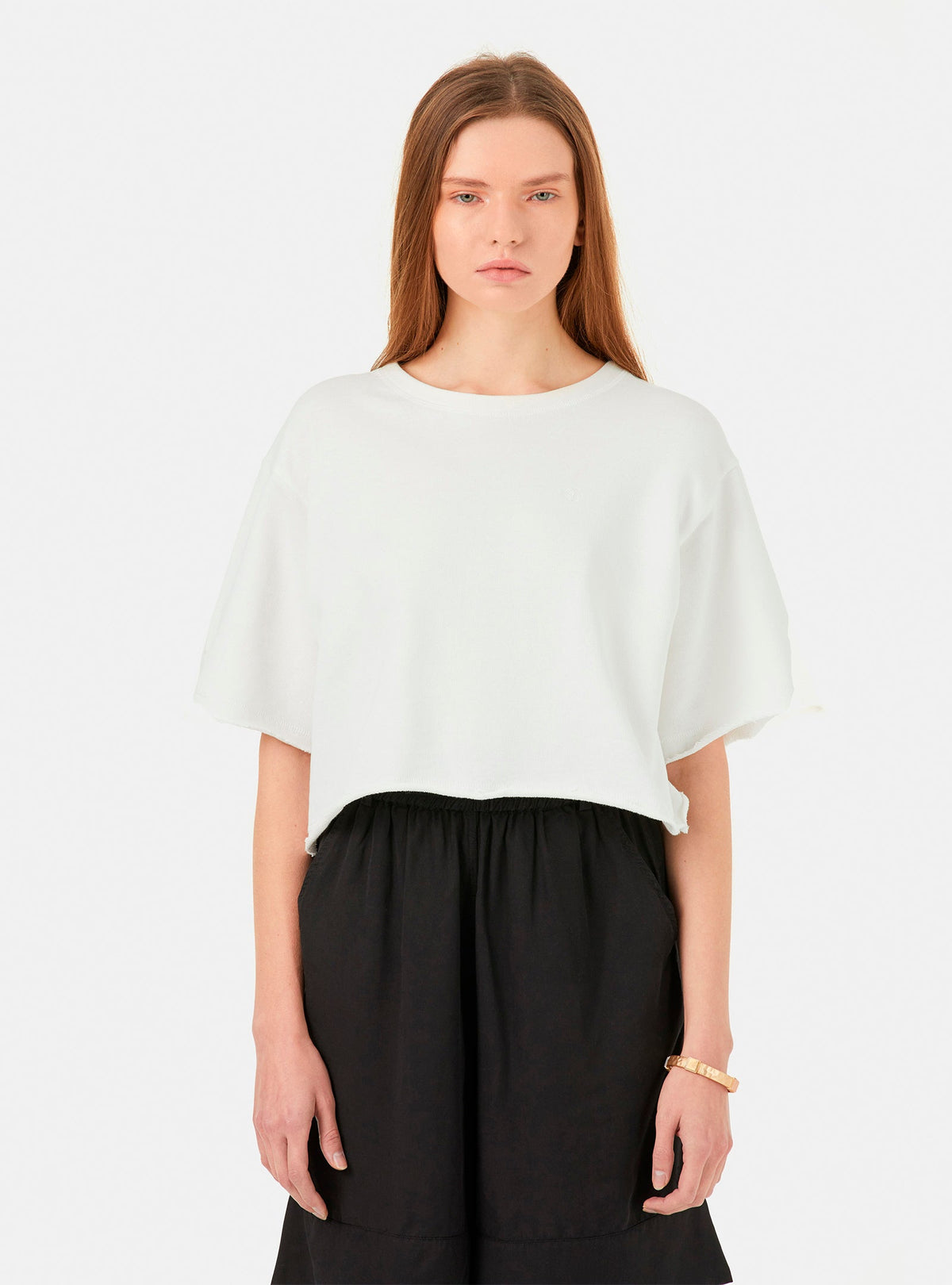 THE OUTLET 9/11 - Up to 70% Wide cropped T-shirt in white. Hand made raw edges on the sleeves and bottom. Made of 100% cotton fleece with soft touch hand feel. New life quality made of left-overs. Round collar with flatlock finish. Brand embroidery on the chest matching background colour. On the back a full top to bottom tape print in white reinforcing the clean aesthetic.
