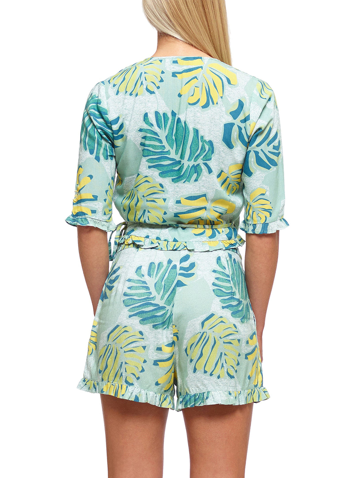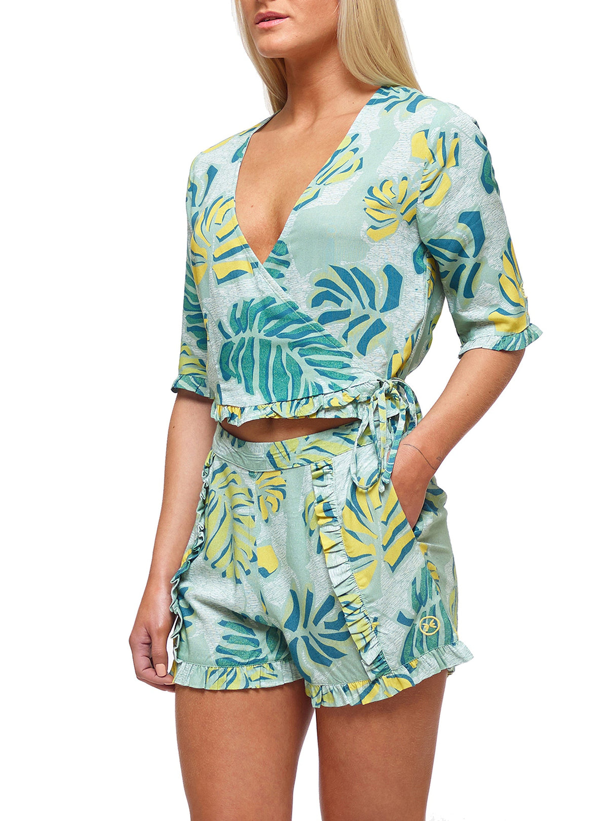 THE OUTLET 9/11 - Up to 70% Short sleeved floral print top. Crossover opening with adjustable side ribbon. Frilled sleeve and bottom.