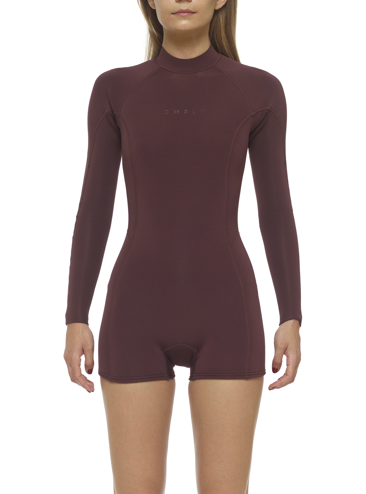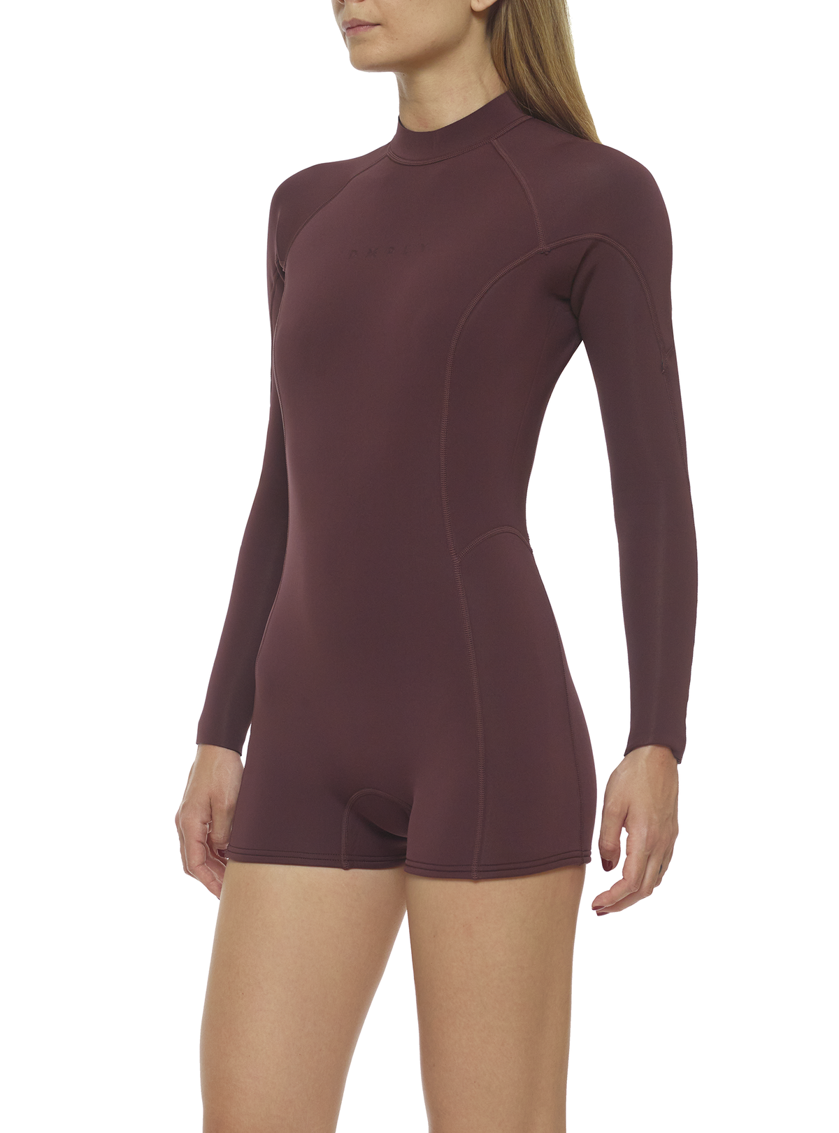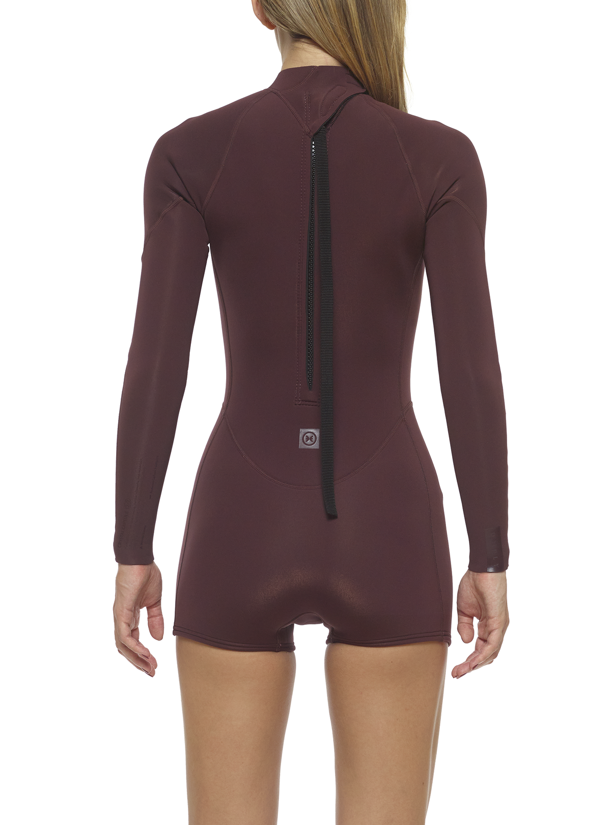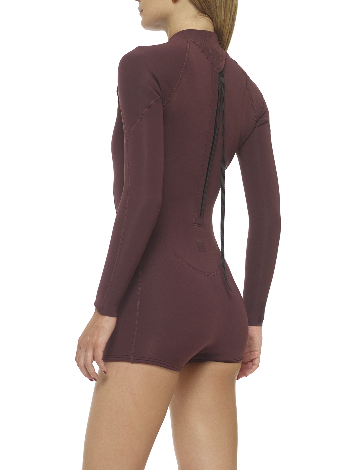 Women back zip 2/2mm spring shorty wetsuit with long sleeves from the Crystal Capsule collection. Recommended for surfing with style in warm waters between 18-22°C.