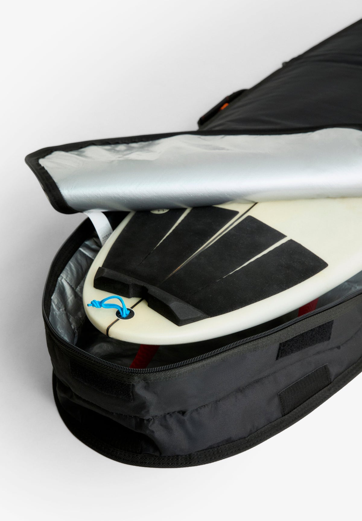 A surfboard bag designed to protect your board every day. Equipped with everything you need to keep it safe: 5mm shock-absorbing foam, durable zippers, lightweight and water-resistant nylon fabric, and a velcro closure panel that allows you to carry your board without removing the fins.